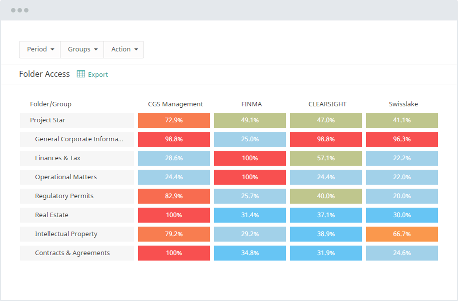 - Erweiterte Berichterstellung generiert detaillierte Berichte über die Aktivitäten im Datenraum, die Interaktionen mit Dokumenten und die Gesamtnutzung des Datenraums und liefert so Einblicke in die M&A-Workflows und den Fortschritt.
