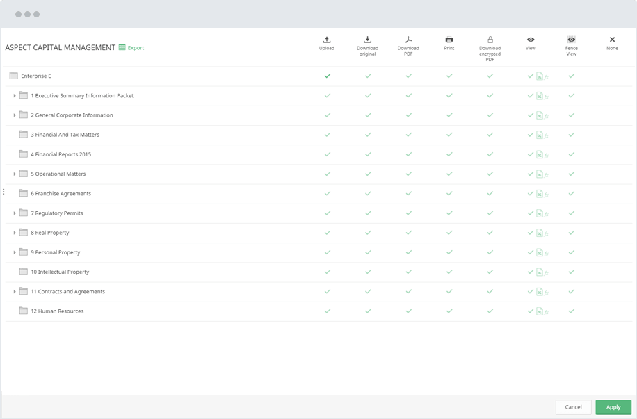 Die Erfüllung spezifischer Anforderungen der Käufer- und Verkäuferseite bei Fusionen und Übernahmen kann sich erheblich auf die Effektivität der Transaktion auswirken. Dank der umfangreichen Datenraumfunktionen können Sie Ihre Auswahl effektiv an diese Anforderungen anpassen.